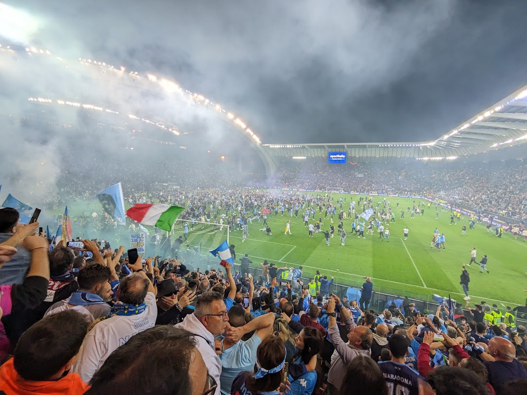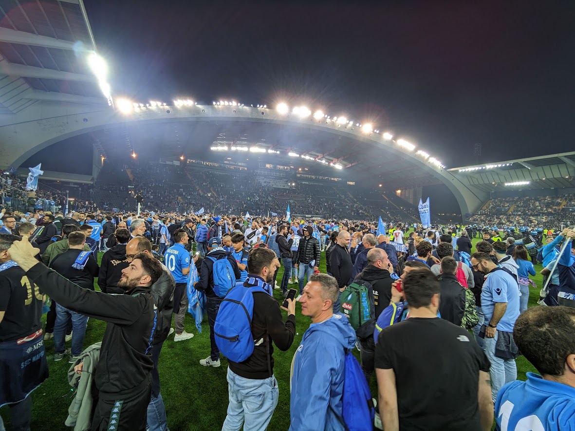 Pred štadiónom to už vrelo. Všetci sme sa s nadšením a očakávaním vybrali na štadión, kde sme zažili atmosféru, akú sme nikdy predtým nezažili. Fanúšikovia Neapolu boli v extáze, spievali a povzbudzovali svojich hráčov od prvých minút až do záverečného hvizdu. Domáci síce vyhrávali, ale v druhom polčase Neapol vyrovnal a bod stačil na zisk titulu. Po konečnom hvizde sa ľudia rozutekali na trávnik a oslava mohla začať. Jeden z klientov bol dokonca prvý pri Lobotkovi a má s ním pamätnú fotografiu.
